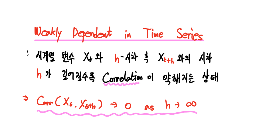 그래서 Weakly dependent 가정은 상관계수가 0으로 수렴한다는 상관관계와 관련한 가정이기 때문에,