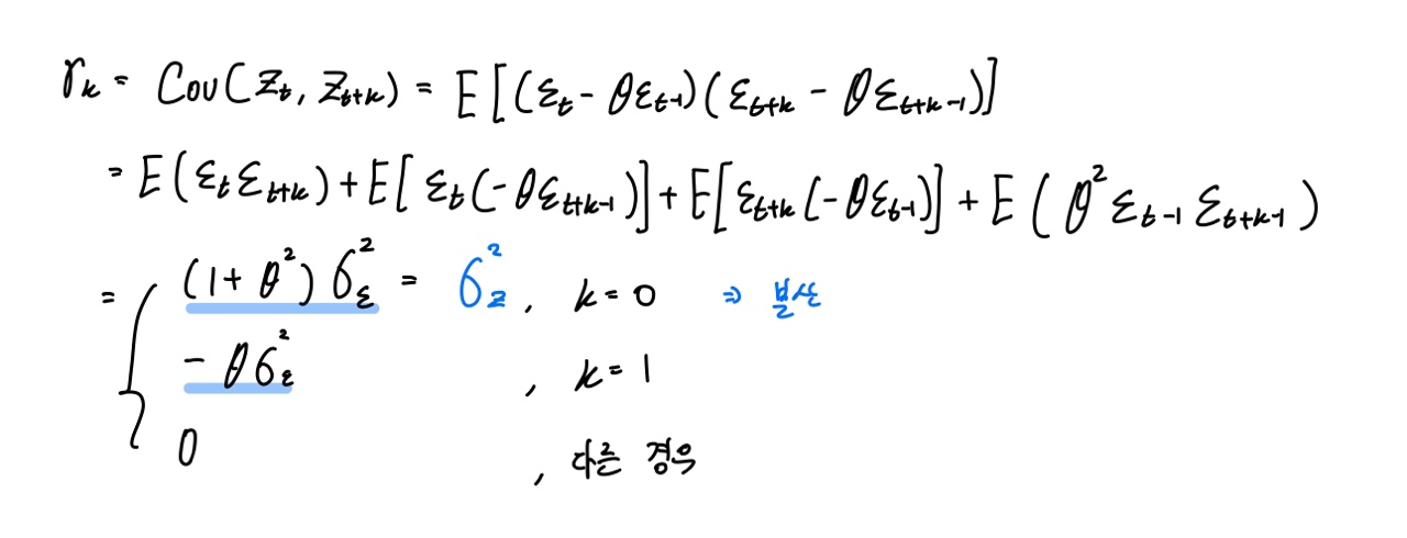 이어서 자기공분산함수를 구해보면 k값에 따라 위와 같이 정의됩니다.