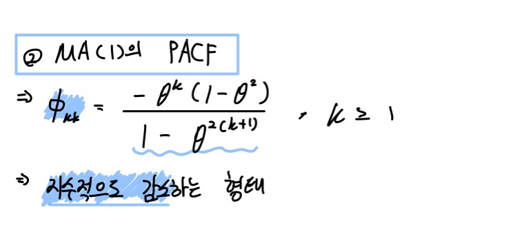 이는 시차가 2 이상인 시계열들은 서로 상관관계가 없음을 의미하며, AR(1) 과정의 PACF처럼 시차 1 이후에는 0이 됩니다.