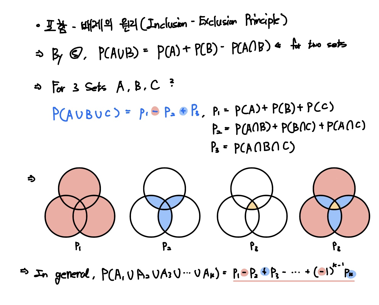 일반항은 $(-1)^{k-1} * p_{k}$ 입니다.만약 사건이 4개(k=4)라면 다음과 같이 합집합을 구할 수 있겠네요.