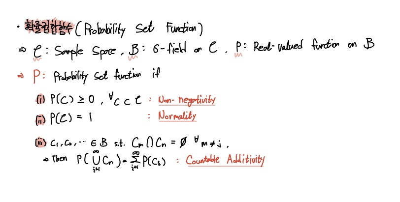 확률의 3가지 공리(Non-negativity, Normality, Countable Additivity)를 만족하는 실함수에 대하여 확률집합함수를 정의할 수 있었죠.