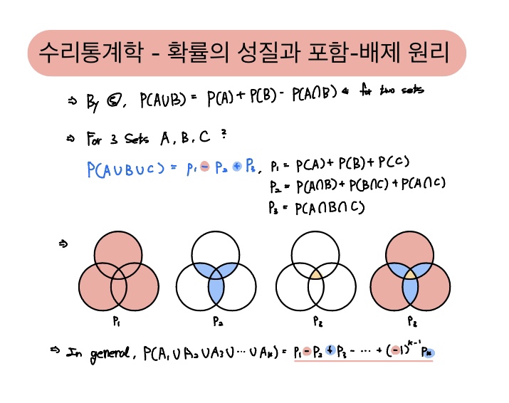 먼저 각 사건을 모두 더하고($p_1$), 두 사건의 교집합들을 빼주고($p_2$), 세 사건의 교집합이 1번 더 빼졌으니 이를 한 번 더해주면($p_3$) 세 사건 A,B,C의 합집합의 확률을 정의할 수 있습니다.