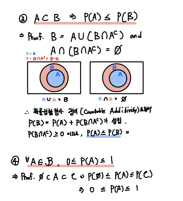 위 식에 확률집합함수의 정의 중 3번째 공리(Countable Additivity)를 이용한다면 P(A)가 P(B)보다 작거나 같음을 보일 수 있습니다.