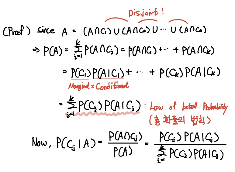 만약 $k$개의 Events $C_1, C_2, \cdots, C_{k}$ 가 Mutually Exclusive하고 Exhaustive한 Set이고, 각 사건의 확률은 0이 아니라고 가정합시다. 즉 $P(C_{i}) > 0, i = 1, 2, \cdots, k$ 이죠.