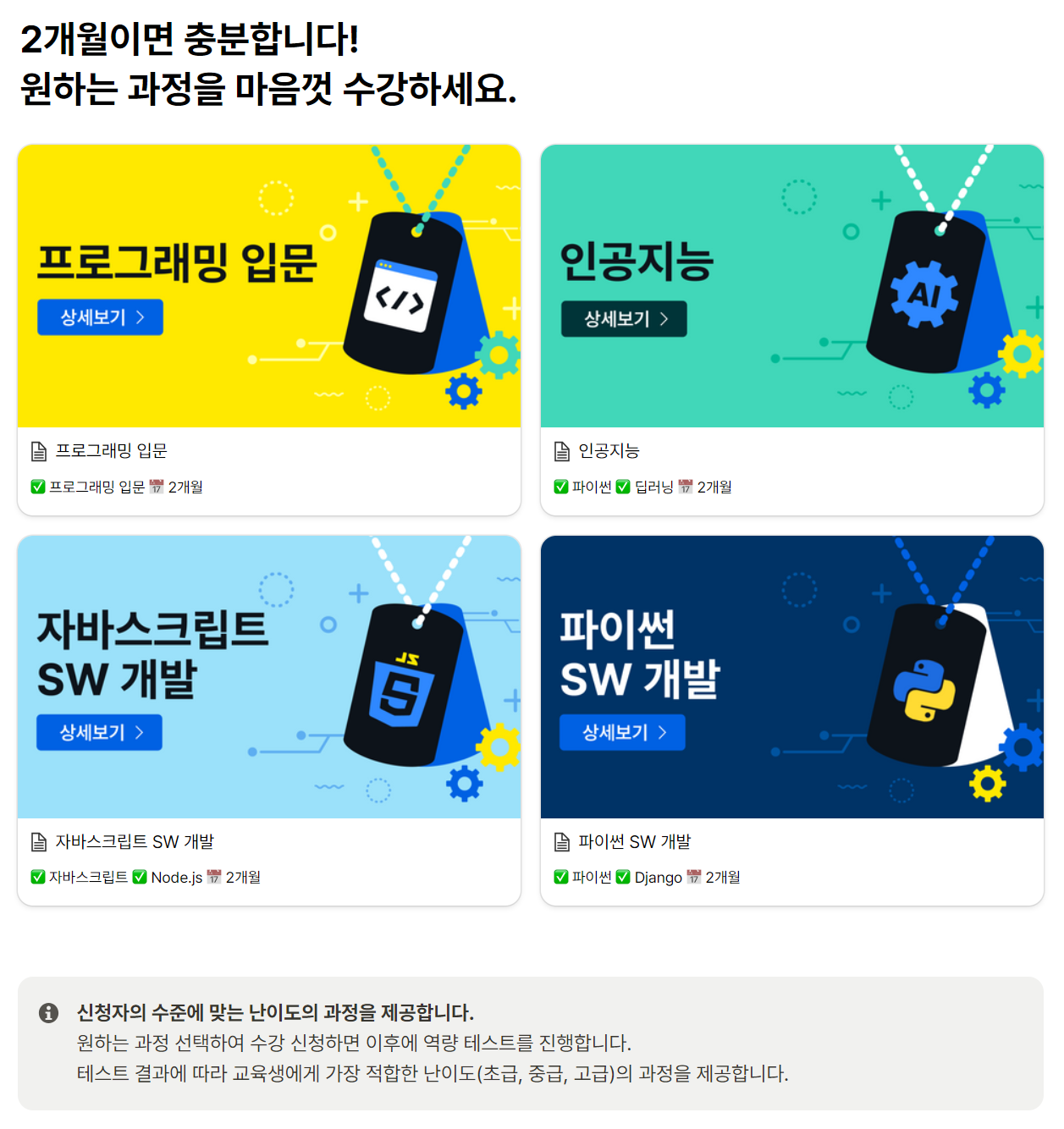 과정을 선택하게 되면 신청자의 수준에 맞는 난이도의 과정을 제공합니다.