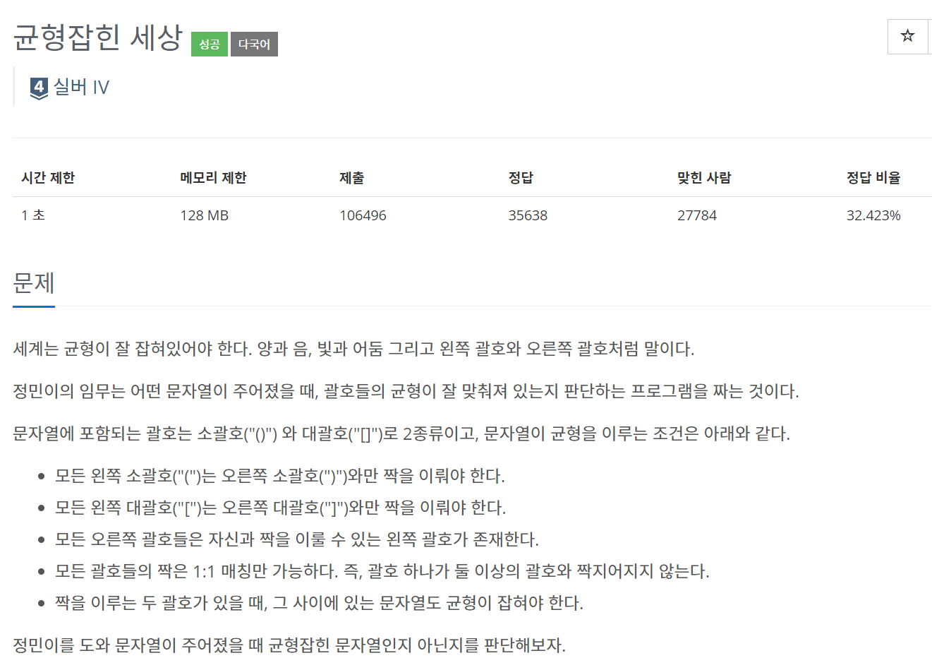 문자열에 포함되는 괄호는 소괄호 ( ), 대괄호 [ ] 두 종류이고, 균형을 이루는 조건은 다음과 같습니다.