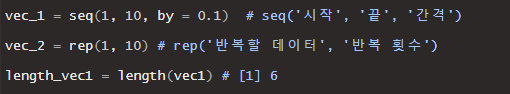 | seq( ) | 특정 수열을 이루고 있는 벡터를 만드는 함수 |