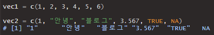 벡터 내 원소는 이전 포스팅에서 확인한 여러 자료형을 혼합해도 상관은 없습니다만... 굳이 그럴 일은 없겠죠?