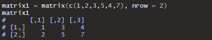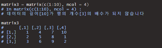 이때 matrix함수의 데이터 배치 순서는 기본적으로 열을 기준으로 배치됩니다.