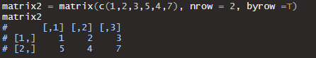 그러나 행을 기준으로 데이터를 넣고 싶다면, byrow = T 라는 옵션을 이용하면 됩니다.