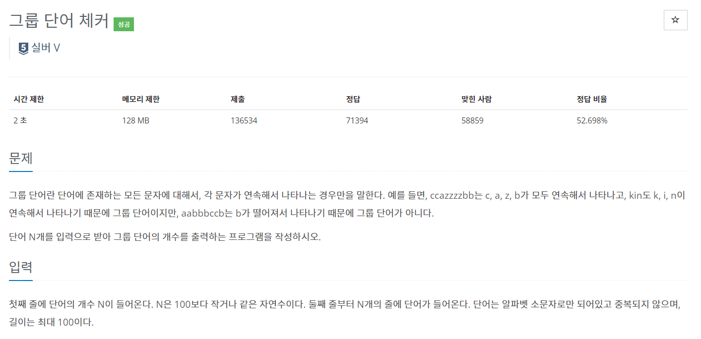 그룹 단어란 단어에 존재하는 모든 문자에 대해서, 각 문자가 연속해서 나타나는 경우만을 말한다. 예를 들면, ccazzzzbb는 c, a, z, b가 모두 연속해서 나타나고, kin도 k, i, n이 연속해서 나타나기 때