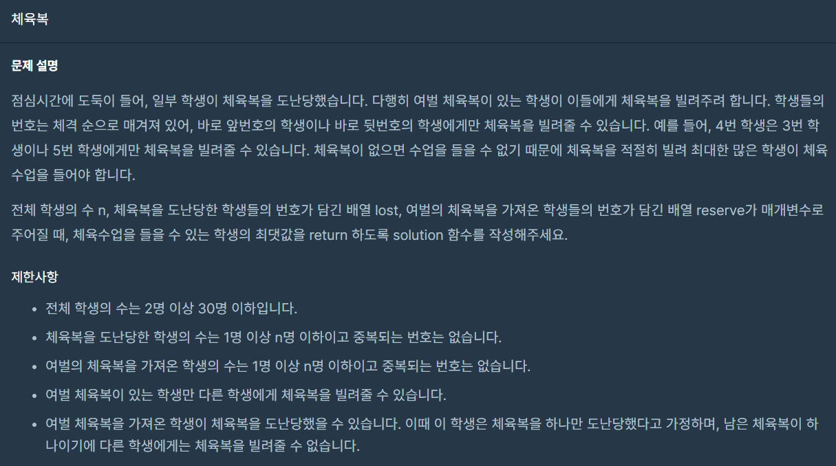 오늘은 프로그래머스(Programmers) 체육복 문제에 대해 다뤄보겠습니다.