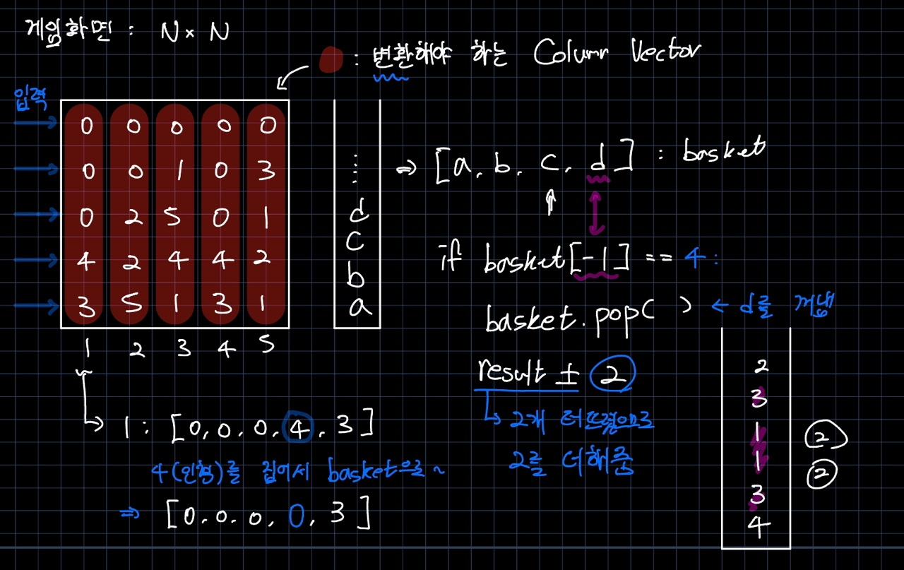 입력은 인형이 들어있는 2차원 배열 board와 어떤 칸을 뽑을지 동작을 결정하는 moves 배열이 주어지고, 옮기는 동작은 moves의 각 원소를 통해 결정됩니다.