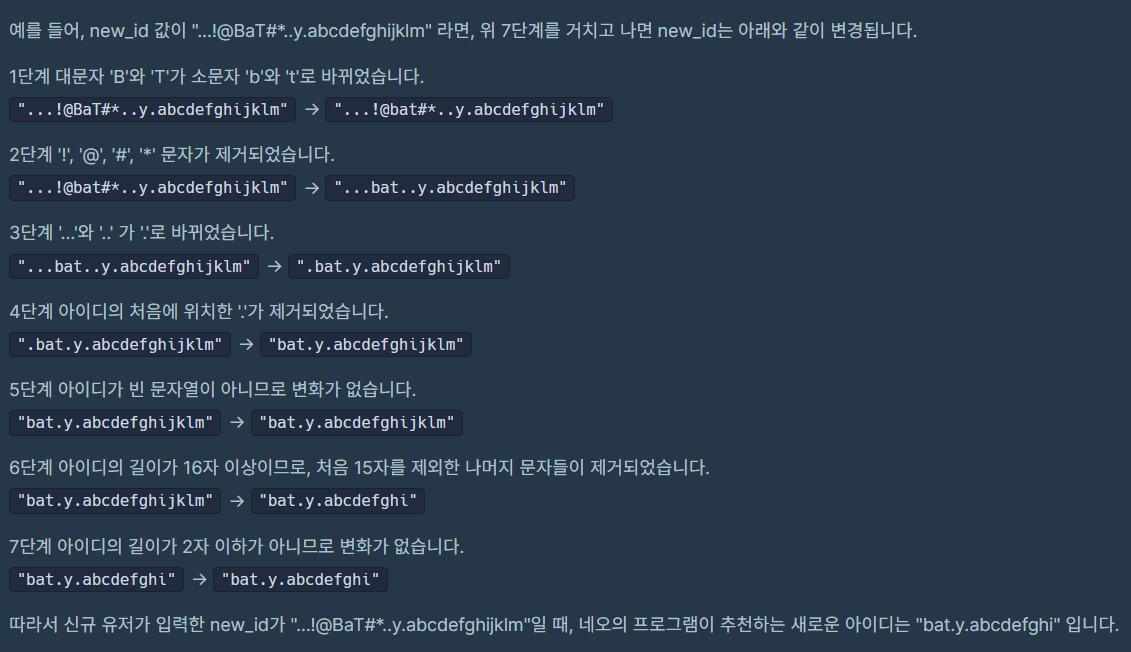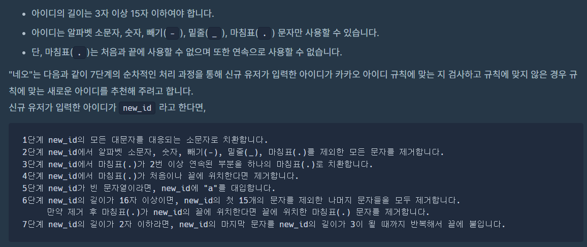 크게 1단계부터 7단계의 절차를 따라 입력된 아이디를 변환하는 과정을 코드 상으로 구현해주면 되는 문제입니다.
