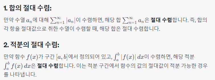 이를 위해 합과 적분의 절대 수렴은 합과 적분의 수렴을 의미한다는 '절대 수렴'의 개념을 간단하게 짚고 넘어가겠습니다.