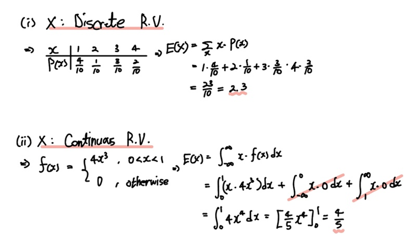 만약 이산확률변수라면 sigma $\sum$ 를 이용해 합을 나타내고,