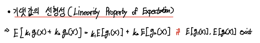 기댓값을 구성하는 $\sum$와 $\int$ 모두 선형 연산자임으로 선형성이 성립함을 쉽게 보일 수 있죠.