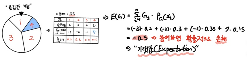 각 숫자와 확률을 곱한 값을 다 더해주면 이 게임에 대한 기대 수익 $\sum G_{i} P_G(x_i)$이 됩니다.