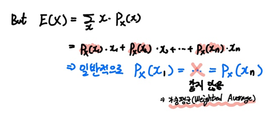 즉 이론상으로 확률변수의 모든 값에 대한 확률이 모두 $\frac{1}{n}$으로 같다면 산술평균과 같겠지만 현실적으로는 어렵겠죠.