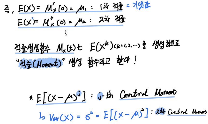 적률생성함수를 k-차 미분하여 $t=0$을 대입하면 $\mu_k = E(X^k)$인 k차 적률(moment)이 생성됩니다.