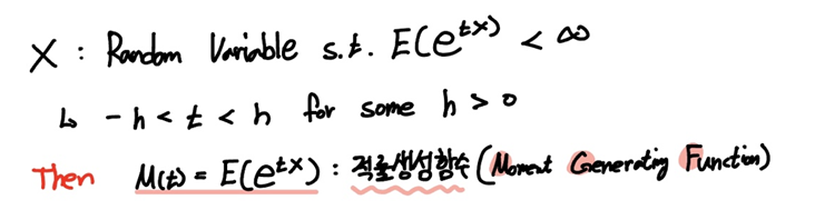 확률변수 $X$를 어떤 양수 $h$에 대하여 $-h < t < h$를 만족하고, $e^{tX}$ 의 기댓값이 존재하는 확률변수라고 합시다.