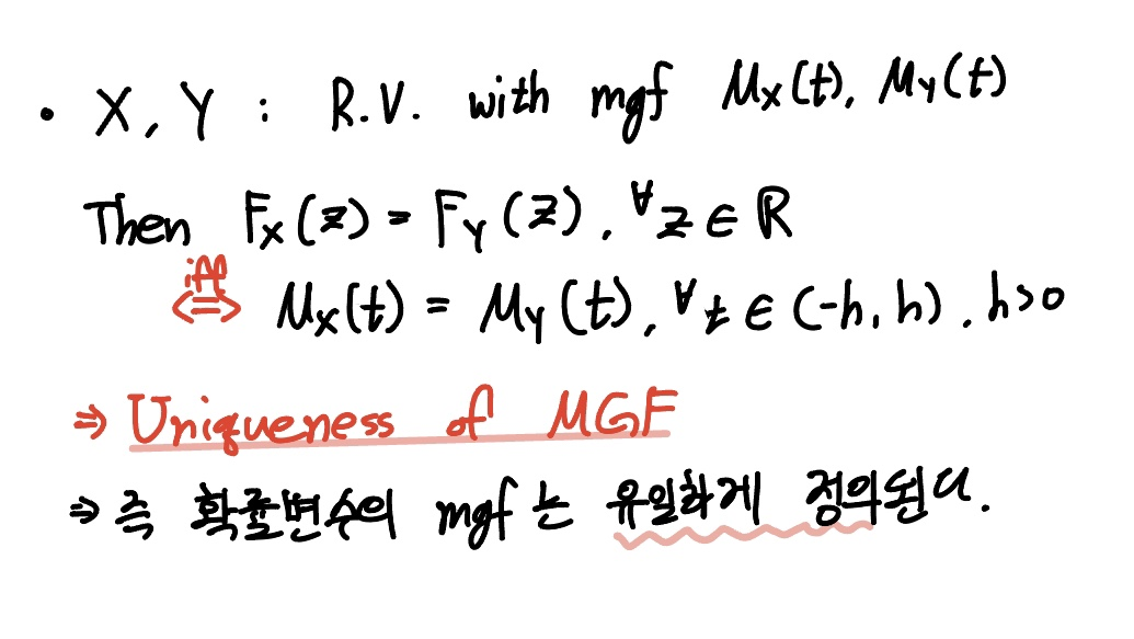 즉 cdf가 같다는 것은 확률변수의 분포가 같다는 것이고, 이러한 확률변수의 mgf도 같다는 것은 확률변수의 mgf는 유일하게 정의됨을 의미합니다.