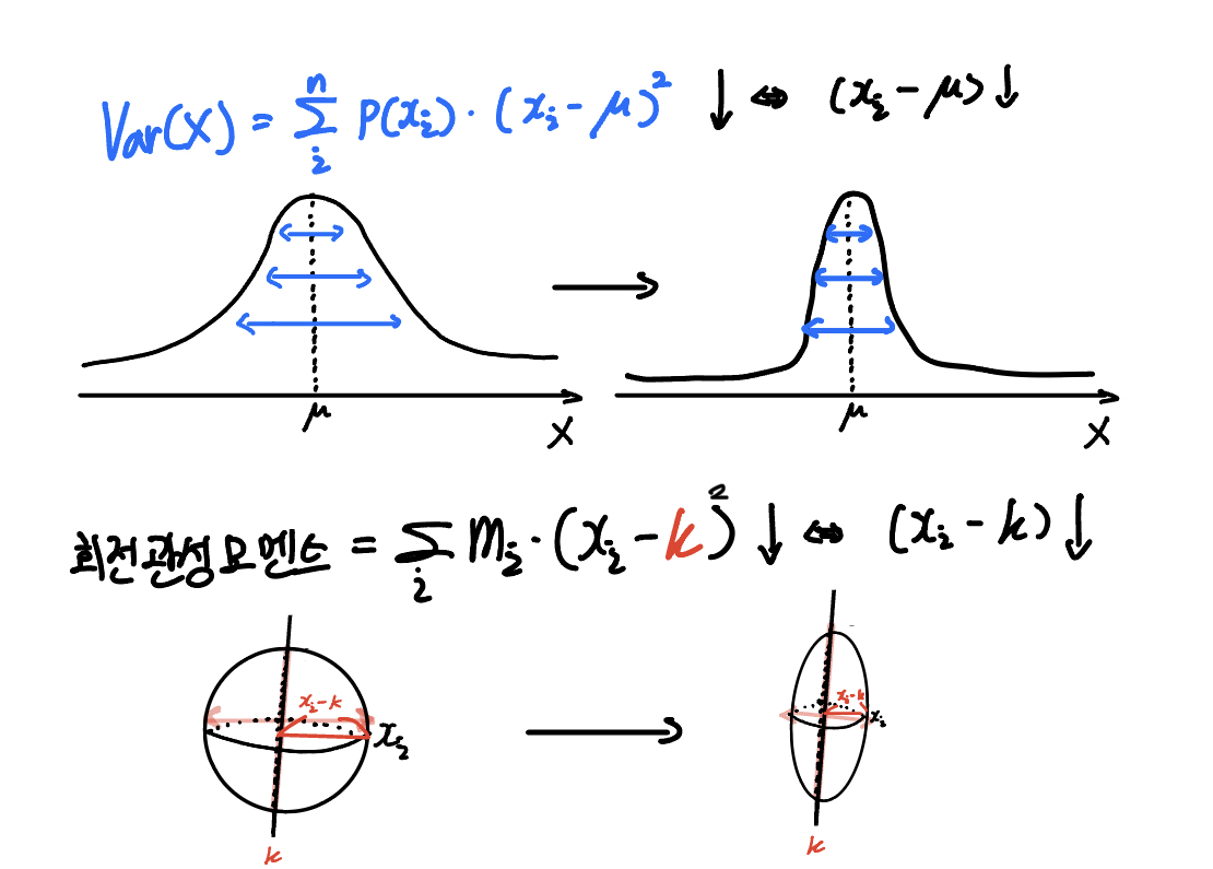 그렇다면 분산, 회전 관성 모멘트 둘다 중심으로부터 가까워지면 어떻게 바뀔까요?