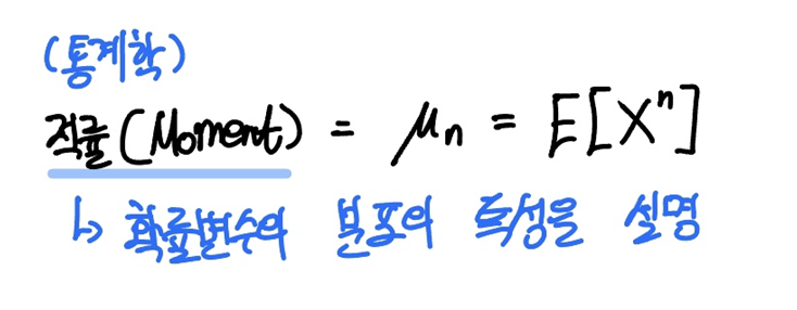 만약 $X$의 n차 제곱한 값의 기댓값을 $E(X^n)$ 이라고 하면, 이를 $\mu _n$ 이라고 하고 편의상 $X$의 n차 적률이라고 합니다.