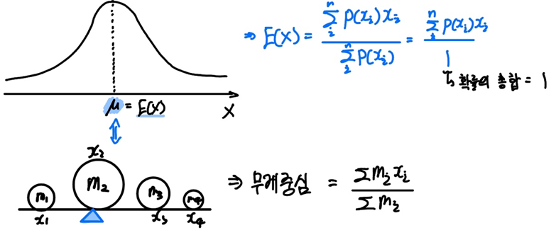 그리고 이 평균 $\mu$는 확률분포의 중심 경향을 나타내므로, 확률분포의 무게 중심이라고도 할 수 있을 것 같습니다.