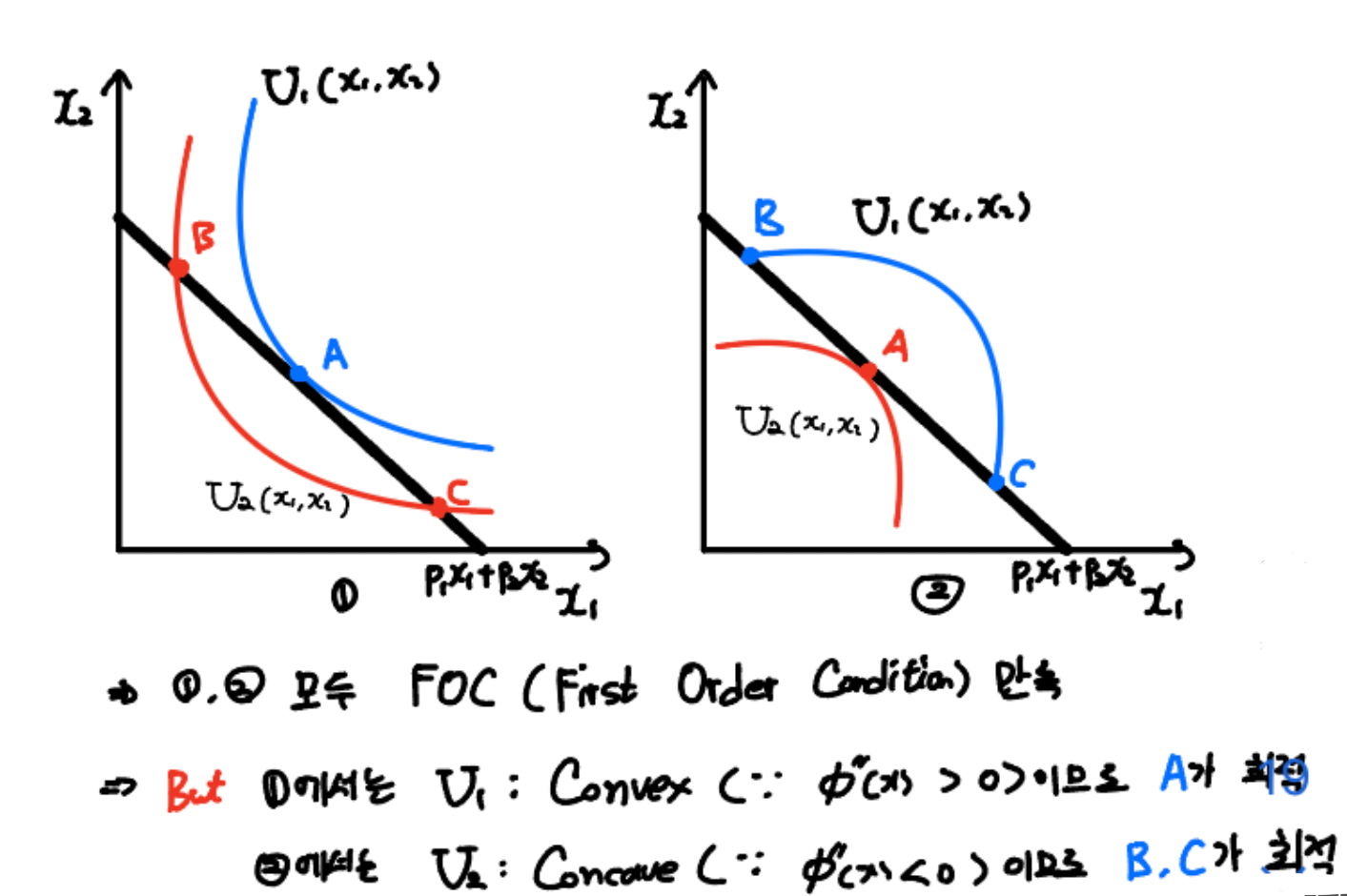 하지만 우측에서 효용함수는 위로 볼록한 Concave이기 때문에 예산제약선과 접하는 A 지점이 최적점이 아닙니다.