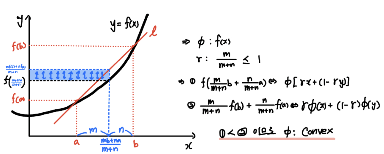 이때 $x$ 를 임의의 $a, b$ 라고 하고, $a, b$를 m:n으로 나누는 중점 $\frac{mb+na}{m+n}$ 을 정의하고, 이 값을 위 컨벡스 함수의 조건식에 대입해보겠습니다.