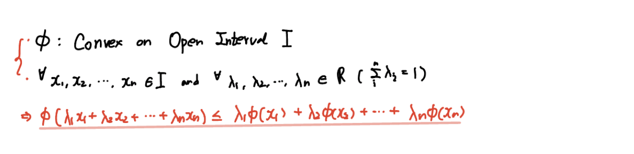 $$ \phi( \lambda_1 x_1 + \lambda_2 x_2 + \cdots+ \lambda_n x_n) \, \leq \, \lambda_1 \phi(x_1) + \lambda_2 \phi(x_2) + \cdots + \lambda_n \phi(x_n) $$