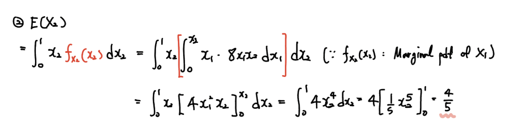 여기서 $X_2$ 의 pdf를 구하기 위해 $\int_{0}^{x_2} [x_{1} \,\, 8x_{1} x_{2}] \,\, dx_{1}$ 을 계산해주면 되겠죠.