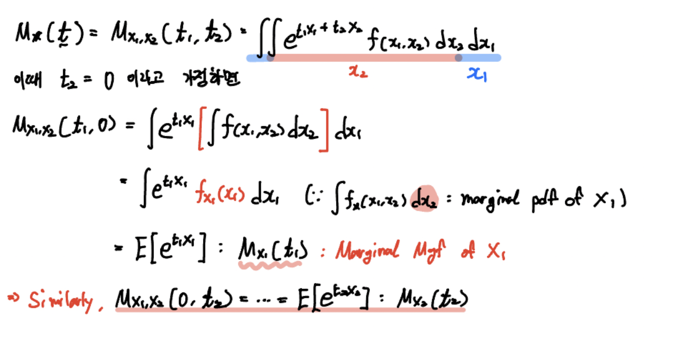만약 $X_1$ 에 대한 mgf를 구하고 싶다면, $X_2$ 에 대응되는 변수인 $t_2$ 를 0으로 만들어주면 되겠죠.