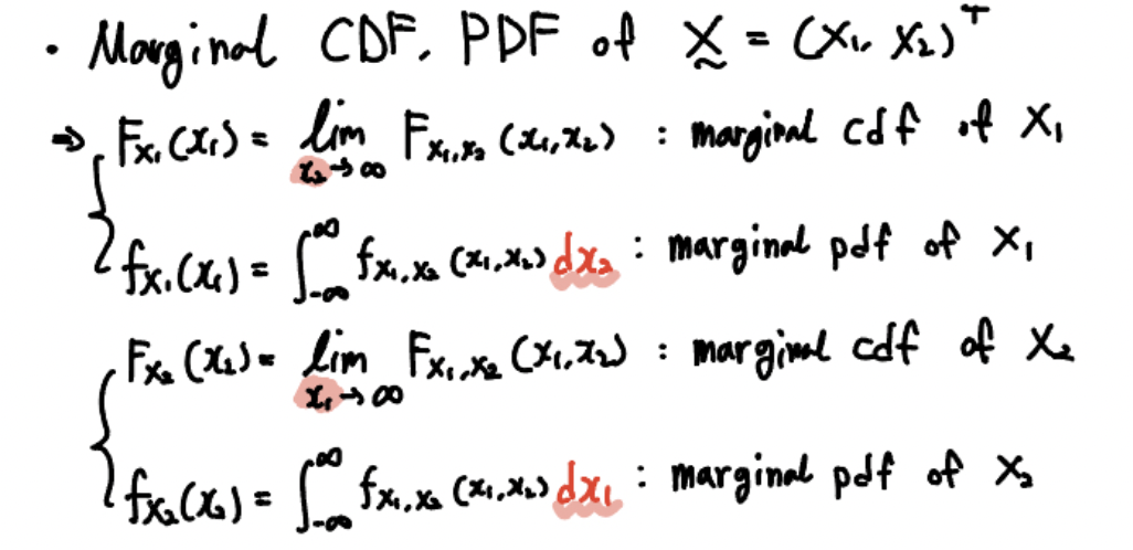다만 joint cdf는 joint pdf가 각 변수에 대해서 적분한 꼴이므로, 미분할 때도 각 변수에 대해 미분해줘야 한다는 차이점이 있겠습니다.
