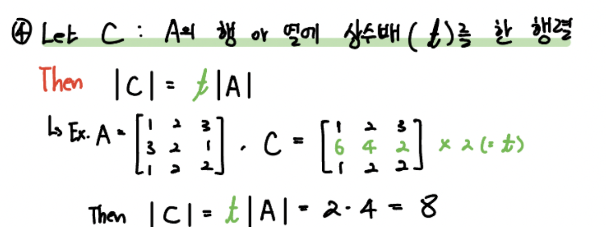 행렬의 한 행, 혹은 열에 상수(scalar)를 곱한 경우, 행렬식은 그 스칼라를 곱한 값과 같아집니다.