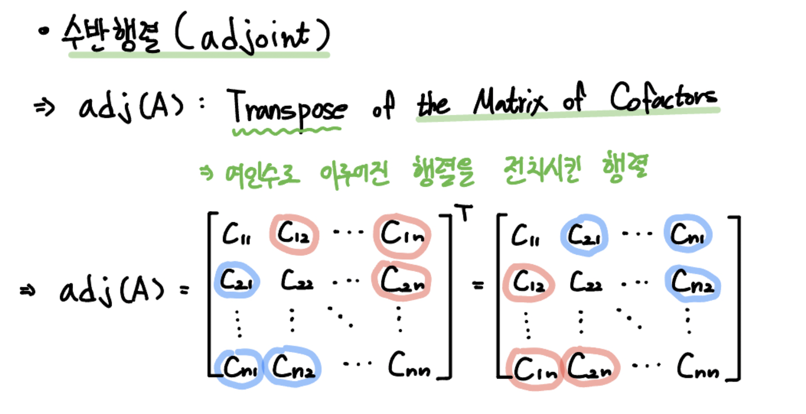 바로 수반 행렬, adjoint라고 불리는 행렬인데요. 수반 행렬은 다소 생소하니 ... 그냥 앞으로 adjoint라고 하겠습니다.