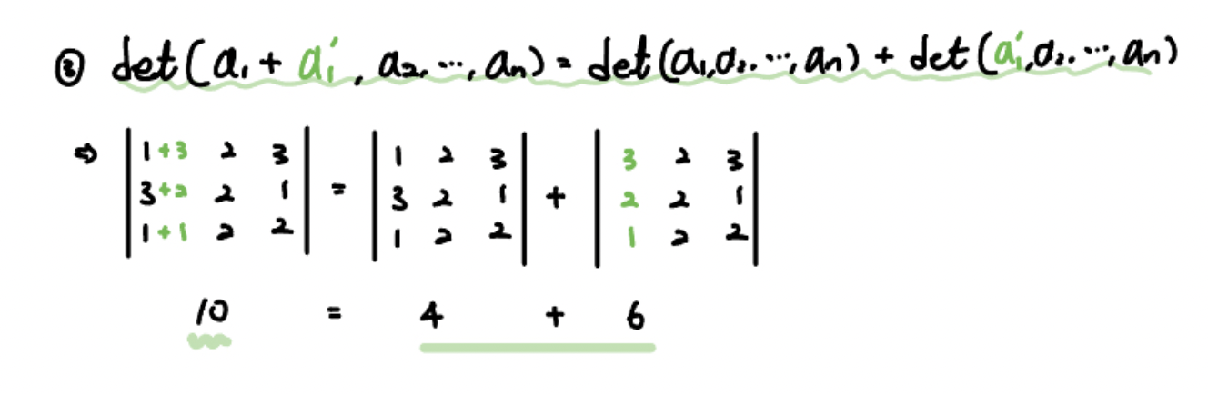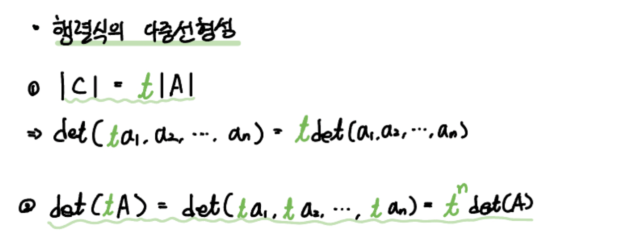 다중선형성은 크게 가산성(Additivity) or 선형성(Linearity), 그리고 동차성(Homogeneity), 교대성(Alternating Property)로 구분해볼 수 있습니다.