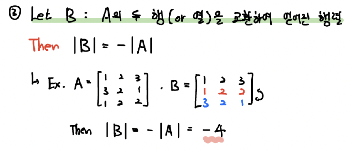 이 행렬의 행렬식은 기존 행렬의 행렬식에 -(음의 부호) 를 붙인 것과 같습니다.