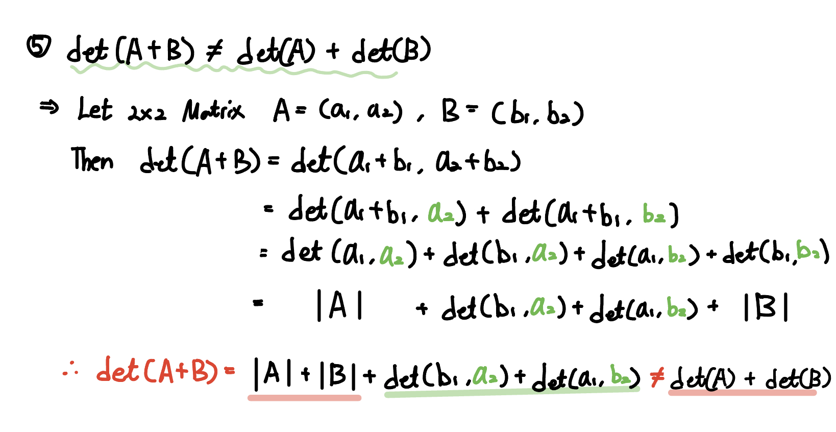 즉 $det\,(A+B)$ 에서는 $det\,(b_{1}, a_{2}) + det\,(a_{1}, b_{2})$ 의 항이 발생하므로 같지 않습니다.