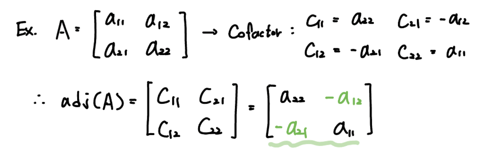 그러면 행렬의 cofactor는 $c_{11} = a_{22}, c_{21} = - a_{12}, c_{12} = - a_{21}, c_{22} = a_{11} $ 라고 할 수 있겠죠.