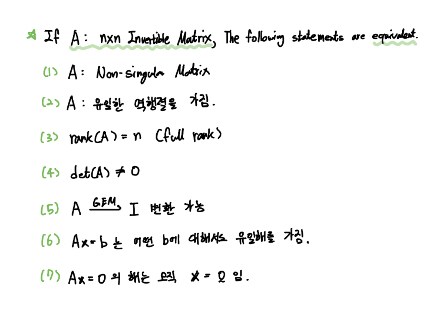 이렇듯 임의의 행렬이 가역행렬(Invertible Matrix)이라면, 다음과 같은 명제는 모두 동치입니다.