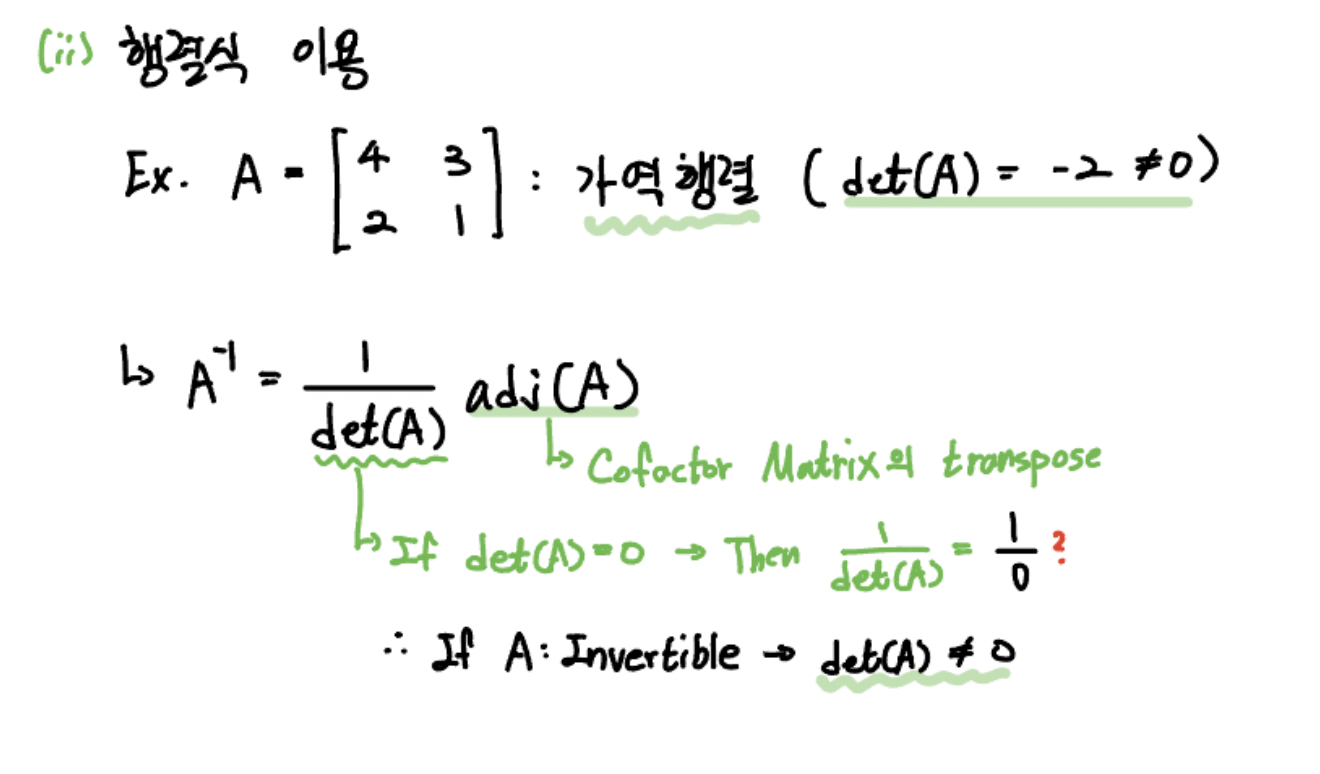 여기서 왜 가역행렬의 행렬식이 0이 되면 안 되는지 이유를 알 수 있습니다.