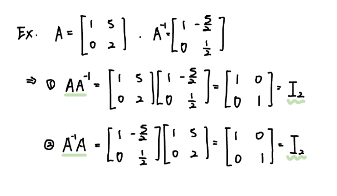 우리는 역행렬을 구하는 방법을 아직 모르지만, $ A = \begin{bmatrix} 1 & 5 \\ 0 & 2 \end{bmatrix} $ 의 역행렬이 $ A^{-1} = \begin{bmatrix} 1 & -\frac{5}{2} \\ 0 & \frac{1}{2} \end{bmatrix} $ 라고 합시다.