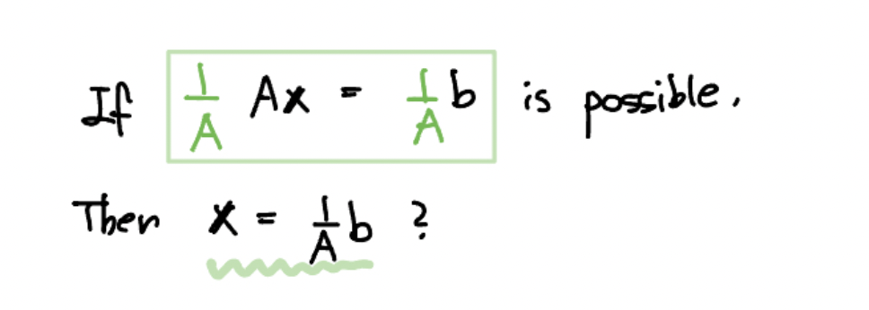 만약 양변에 $A$ 의 역수를 곱합으로써 $ \frac{1}{A} \,Ax = \frac{1}{A} \, b $ 라는 식이 가능하다면,