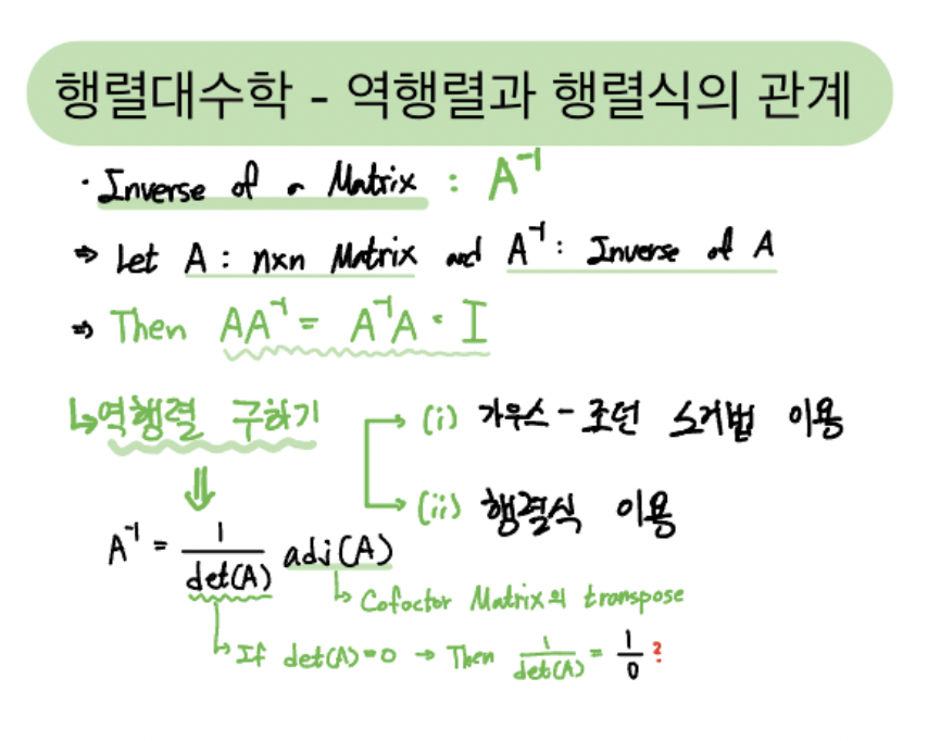 만약 행렬식이 0이라면 $\frac{1}{0}$ 은 정의할 수 없으므로 역행렬 $A^{-1}$ 은 존재할 수 없죠.