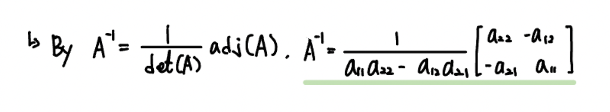 이때 지난 포스팅에서 다루었던 행렬식을 이용해 구하는 '역행렬(Inverse Matrix)'의 공식 $A^{-1} = \frac{1}{det \,\,(A)} \,\, adj \,\,(A)$ 에 의해 역행렬은 다음과 같이 쓸 수 있겠죠.