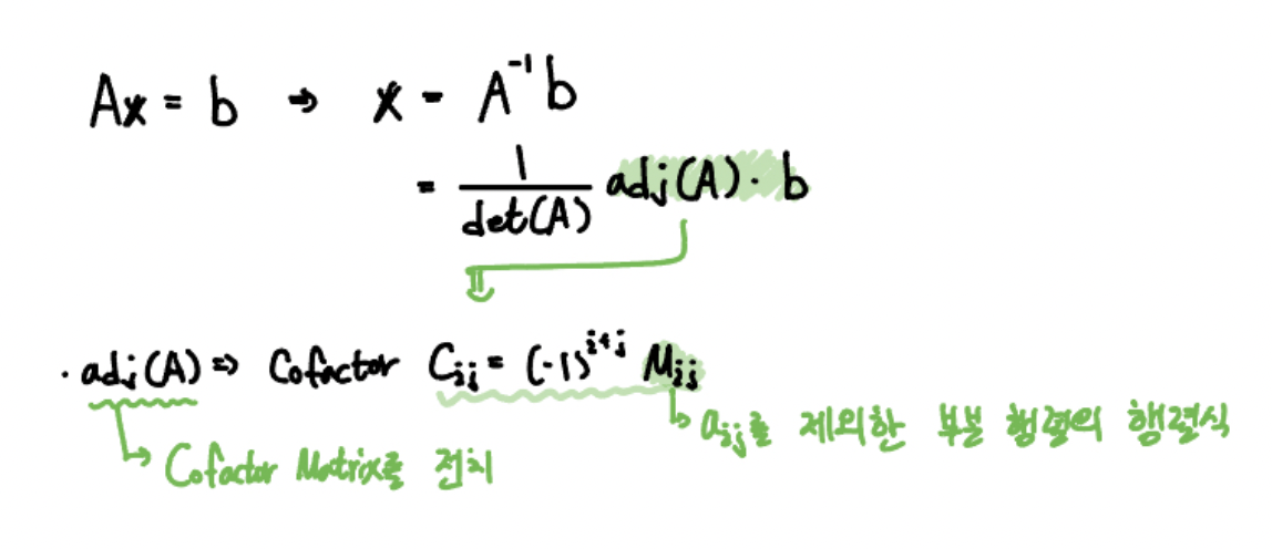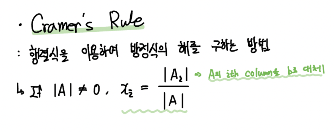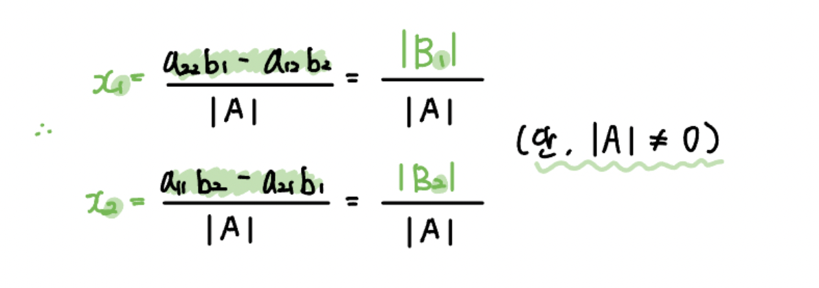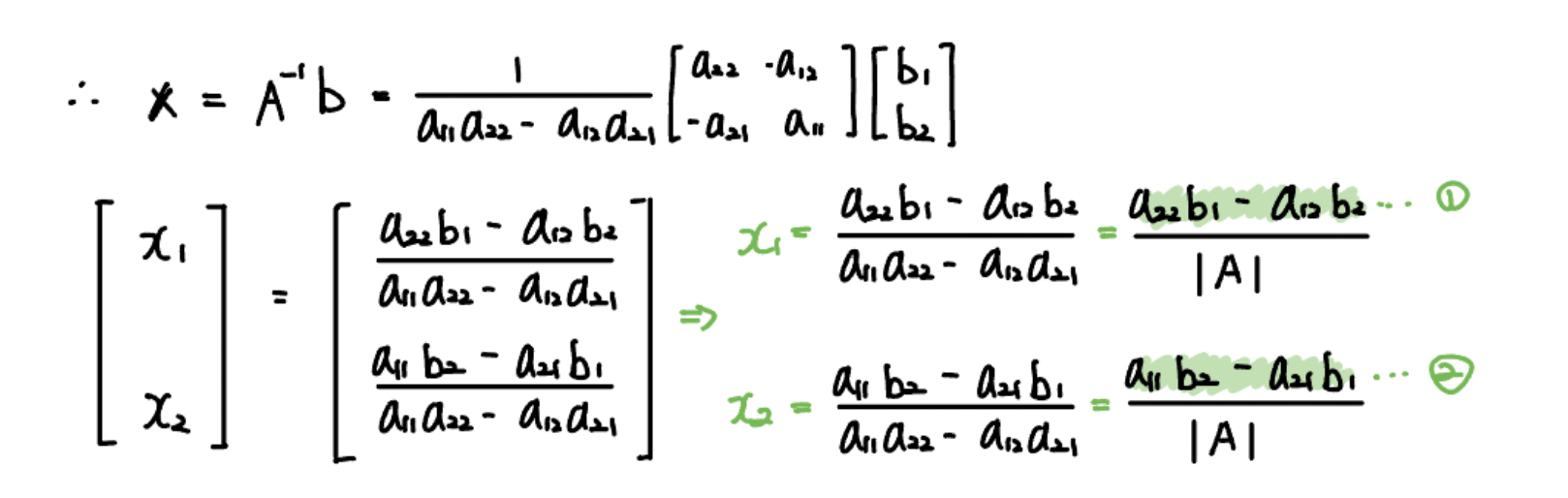 이때 방정식의 해 $x$ 의 분모는 행렬식임을 직관적으로 이해할 수 있는데요.