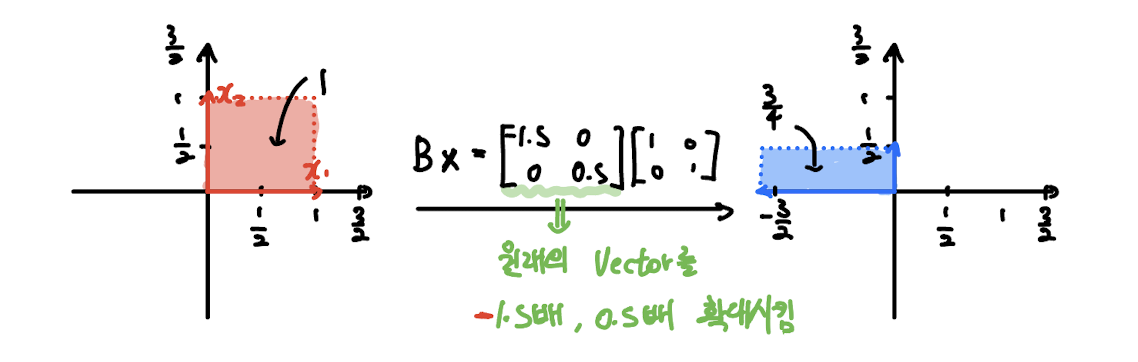 이는 결론적으로 행렬 $B$ 에 의해, $x_1$ 은 -1.5배 확대된 셈이 됐고, $x_2$ 는 0.5배로 확대된 셈이 됐네요.