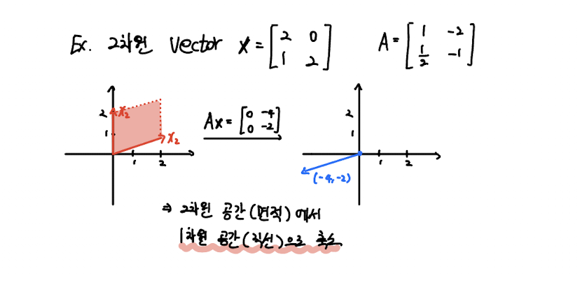 예상하셨겠지만 행렬식이 0인 행렬에 의한 선형변환은 주어진 벡터, 행렬의 차원의 축소를 수반합니다.